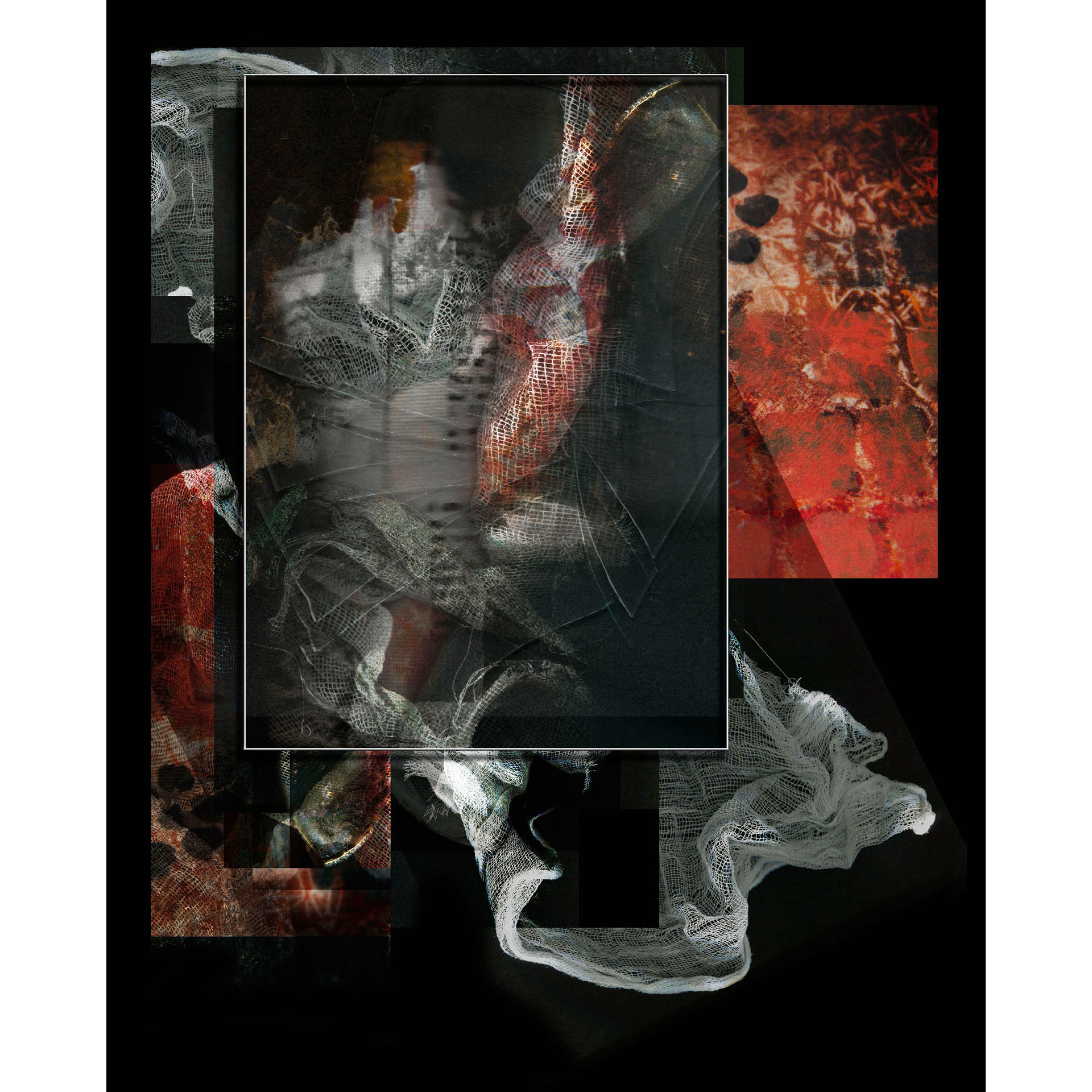 "Otro panorama de la guerra fría con información falsa y demostración de fuerzas. Por lo tanto, el uso de banderas en blanco y negro que colonizan la periferia de un cuerpo (el cuerpo como metáfora de la geografía individual, también como un borde) oculto[...]